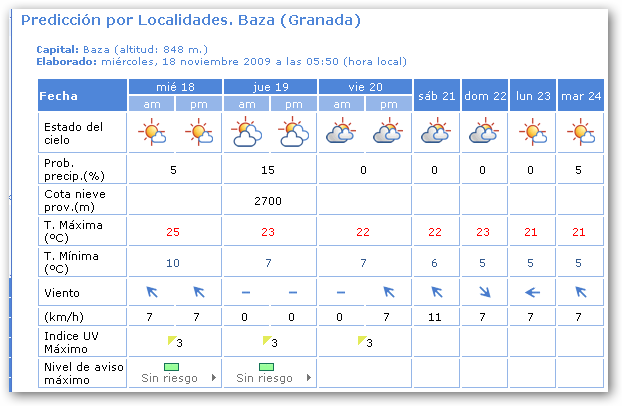 Intervalos nubosos con predominio de nubes medias y altas. Brumas y posibles bancos de niebla matinales en el litoral. Temperaturas sin cambios o en ligero descenso. Vientos flojos y variables en el interior, y de componente Este flojos tendiendo a moderados por la tarde en el litoral.
