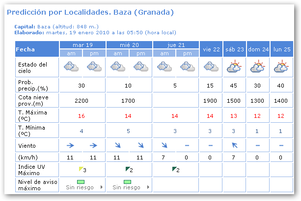 Intervalos nubosos en el litoral; cielos nubosos en el interior con posibilidad de precipitaciones débiles y dispersas, más probables cuanto más al Oeste y al Norte. Brumas y posibles bancos de niebla matinales en el interior. Temperaturas en ligero a moderado descenso. Vientos de componente Oeste flojos, aumentando por la tarde a flojos a moderados en el interior; y a moderados en el litoral, con algún intervalo de fuertes en el litoral.