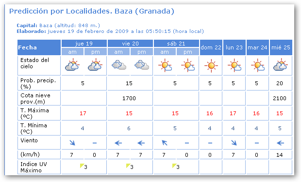 Intervalos nubosos matinales en el litoral; cielos poco nubosos o despejados en el resto. Brumas matiales costeras. Temperaturas nocturnas sin cambios o en ligero ascenso; diurnas sin cambios. Vientos variables flojos tendiendo en el litoral a componente Este flojos.