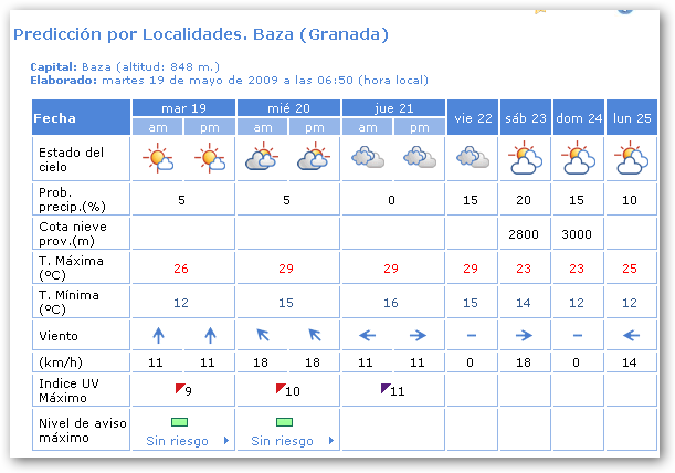 Cielos poco nubosos con intervalos nubosos de nubes medias y altas y nubosidad de evolución en las sierras orientales donde son probables chubascos ocasionalmente acompañados de tormenta. Brumas matinales costeras. Temperaturas en ligero ascenso. Vientos flojos a moderados de componente sur en el interior; de componente este flojos a moderados en el litoral.