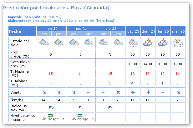 Poco nuboso en el litoral; en el resto, cielos nubosos, con posibilidad de precipitaciones débiles y dispersas durante la mañana en el tercio norte, tendiendo a poco nuboso a partir de la tarde salvo en el extremo nordeste. Temperaturas sin cambios o en ligero descenso. Brumas matinales y bancos de niebla en el interior. Vientos de componete Oeste, flojos a moderados en el interior y moderados en el litoral, tendiendo a disminuir por la tarde.