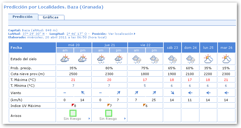 Intervalos nubosos aumentando a nubosos en el interior con posibilidad de chubascos débiles y dispersos, menos probables hacia el tercio oriental, y que pueden ser localmente moderados y acompañados de tormentas durante la tarde en el interior. A últimas horas, cielos nubosos con posibilidad de precitaciones débiles, más probables en la franja litoral. Temperaturas en ligero ascenso. Vientos de componente Sur flojos a moderados en el interior, y de componente Este moderados en el litoral, aumentando a fuertes por la tarde en el litoral oriental.