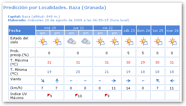 «Cielos poco nubosos o despejados aumentando a intervalos nubosos al final del día en el litoral. Posibles bancos de niebla matinales en puntos del litoral. Temperaturas sin cambios, o diurnas en ligero descenso. Vientos variables flojos en el Interior; de componente Oeste flojos en el litoral girando a componente Este.