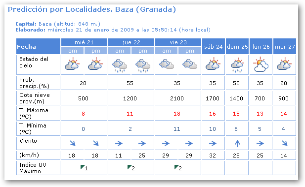 Vientos: Rachas máximas 70km/h. (Desde las 12’00 del 22/01/2009 a 00’00 del 23/01/2009)