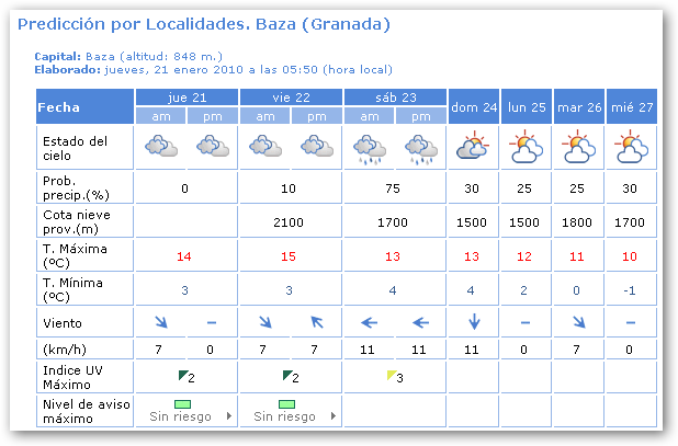 Poco nuboso, con intervalos de nubes bajas en el interior durante la mañana, e intervalos de nubes medias y altas en general por la tarde. Brumas y bancos de niela matinales en puntos del interior. Temperaturas sin cambios o en ligero descenso. Vientos flojos variables.