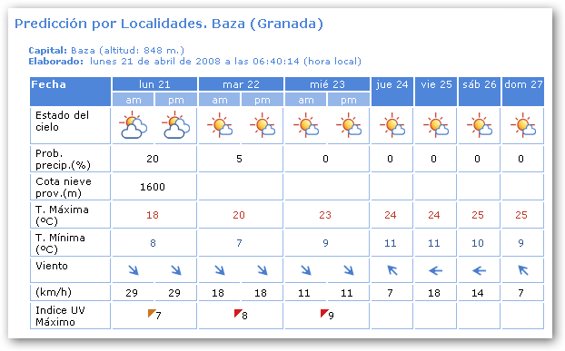 «Cielos nubosos en las comarcas del interior occidental con chubascos débiles, o localmente moderados, siendo en forma de nieve en cotas superiores a 1500-1700mts, tendiendo a poco nubosos durante la tarde; cielos poco nubosos en el resto. Temperaturas diurnas en ligero ascenso.Vientos de componente Oeste moderados en el interior, y fuertes en el litoral y cotas altas, tendiendo a disminuir a flojos hacia el final del día.