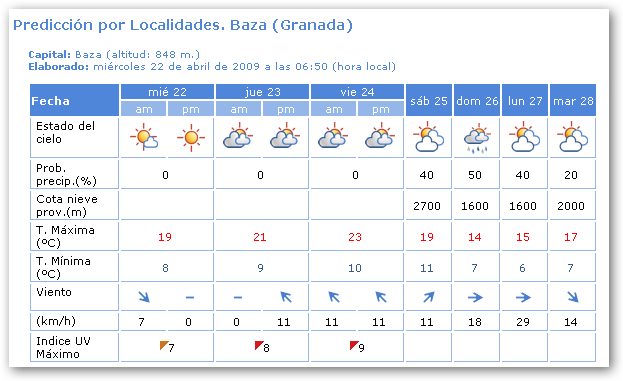 Intervalos nubosos en el litoral. Poco nuboso o despejado en el interior, con nubosidad de evolución en las sierras orientales, donde hay posibilidad de algún chubasco débil aislado. Brumas y posibles bancos de niebla matinales en el litoral. Temperaturas sin cambios. Vientos flojos variables, con predominio de la componente norte en el Interior, y de la componente Este en el litoral.