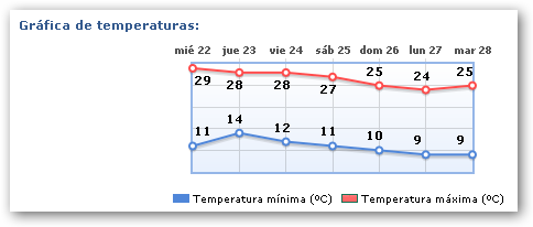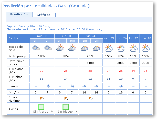 Intervalos de nubes altas. Brumas matinales en el interior. Temperaturas mínimas sin cambios o en ligero descenso; máximas en ligero a moderado ascenso. Vientos de componente Este flojos a moderados en el litoral; flojos variables tendiendo y aumentando a Suroeste flojos a moderados en el interior.