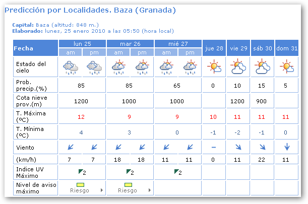 Intervalos nubosos en el interior al principio; nubosos o muy nuboso en el litoral, con chubascos débiles a moderados, extendiendose la nubosidad y las precipitaciones durante la mañana hacia el interior, donde seran débiles, y ocasionalmente moderadas a partir de la tarde. Cota de nieve en descenso hasta los 1000 metros al Norte y los 1200 metros al Sur. Temperaturas sin cambios o en ligero descenso. En el interior, vientos del Nordeste flojos; en el litoral, vientos variables flojos, tendiendo al final a componente Este flojos a moderados.