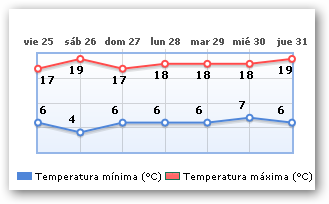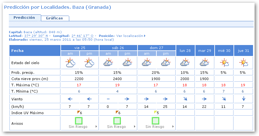 Cielos con intervalos nubosos, aumentando a nuboso en el interior, con chubascos que pueden ser localmente moderados y ocasionalmente acompañados de tormentas, menos probables cuanto más al Sur; poco nuboso en la franja litoral, salvo intervalos nubosos en las horas centrales del día. Temperaturas mínimas en ligero descenso, y máximas en ligero a moderado ascenso. Vientos de componente Este, flojos a moderados en el interior y moderados con intervalos fuertes en el litoral, disminuyendo por la tarde.
