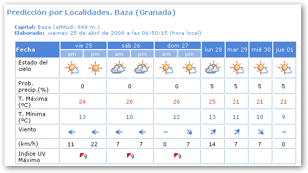 «Cielos poco nubosos con intervalos de nubes altas. Brumas matiales costeras. Temperaturas mínimas sin cambios o en ligero asceso; máximas sin cambios. Vientos de componente Este, flojos a moderados en el interior y de moderados a fuertes en el litoral.