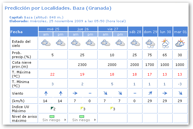 Cielos poco nubosos aumentando durante la tarde a nubosos, con posibilidad de precipitaciones débiles a últimas horas, en las comarcas occidentales y a intervalos nubosos de tipo medio y alto en el resto. Brumas. Temperaturas sin cambios o en ligero descenso. Vientos variables flojos girando a componente Oeste, flojos a moderados en el interior y moderados con intervalos de fuertes en el litoral oriental.
