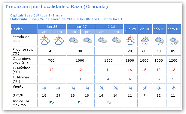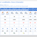 Cielos poco nubosos, con intervalos de nubes medias y altas en el litoral; cielos nubosos a muy nubosos en el interior, con precipitaciones débiles, o localmente moderados, tendiendo a poco nuboso a partir de la tarde. La cota de nieve se sitúa en 600 m. Temperaturas en ligero a moderado descenso, mas acusado en las máximas. Viento del oeste, moderados a fuertes en el interior con rachas de muy fuertes, especialmente en el interior más oriental y en zonas altas; fuertes con rachas muy fuertes en el litoral.