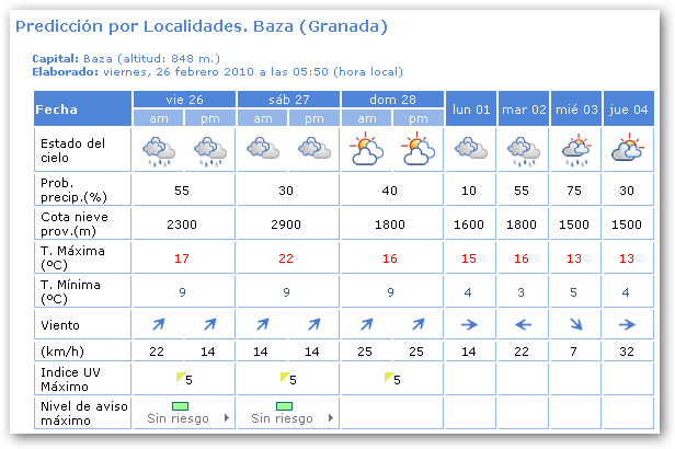 Nuboso o muy nuboso, con precipitaciones débiles a moderadas, menos probables cuanto más al Sur y al Este. Temperaturas máximas sin cambios en el litoral y en ligero descenso en el interior. Vientos de componente Oeste flojos a moderados con intervalos de intensidad fuerte en el litoral a primeras horas, tendiendo durante la tarde a variables flojos.