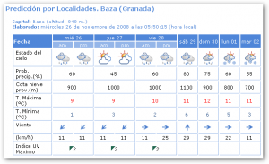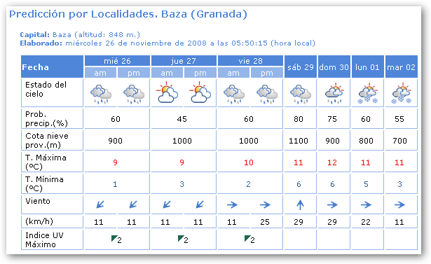 Cielos con intervalos nubosos, aumentando a nubosos o muy nubosos, la franja litoral con chubascos débiles a moderados que pueden ir acompañados de tormentas; cielos poco nubosos en el interior, aumentando por la tarde a nubosos con predominio de nubes medias y altas. La cota de nieve se situará en 800-1000m. Temperaturas en ligero descenso. Vientos de componente Este, flojos a moderados en el interior, moderados en el interior, moderados en el litoral, aumentando por la tarde a fuertes.