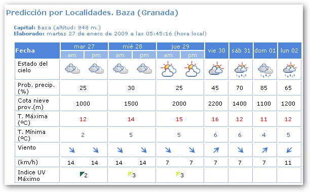 Intervalos nubosos matinales en el interior occidental y cielos poco nubosos en el resto, aumentando durante la mañana a nubosos con predominio de nubes altas en el litoral e interior extremo oriental. Temperatuas mínimas sin cambios o en ligero descenso; máximas en ligero ascenso, localmente moderado en el interior. Vientos de componente Oeste moderados con intervalos fuertes en el litoral e interior extremo oriental y moderados en el resto.