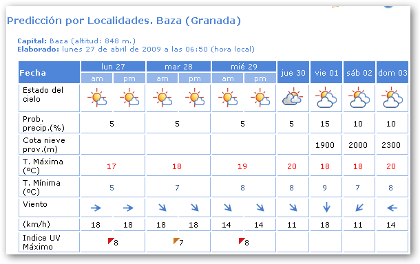 Poco nuboso con intervalos de nubes medias y altas. Temperaturas nocturnas sin cambios o en ligero descenso, y diurnas en moderado ascenso. Vientos de componente oeste flojos a moderados en el interior, y moderados a fuertes en el litoral.