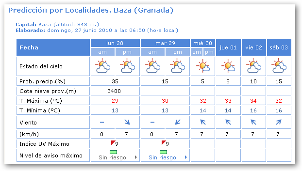 En el litoral, poco nuboso con intervalos de nubes medias y altas. En el interior, intervalos nubosos con con nubosidad de evolución, y chubascos débiles o localmente moderados que podrían ir acompañados de tormentas, más probables en zonas de montaña. Temperaturas sin cambios o en ligero descenso. Vientos flojos varibales con brisas en el litoral.