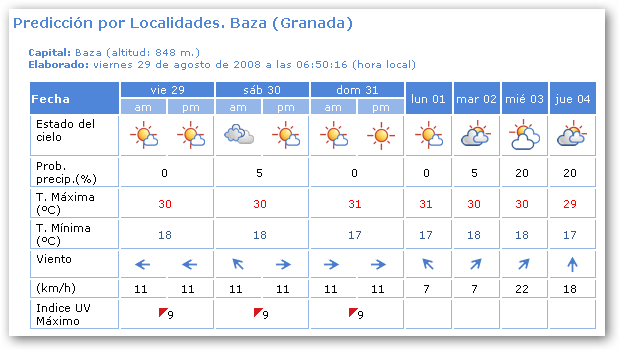«Cielos poco nubosos, con nubosidad de evolución por la tarde en las sierras, donde es posible algún chubasco ocasional. Temperaturas sin cambios, o máximas en ligero ascenso. Vientos de componente Este moderados en el litoral y flojos a moderados, con predominio de la componente Sur, en el interior.