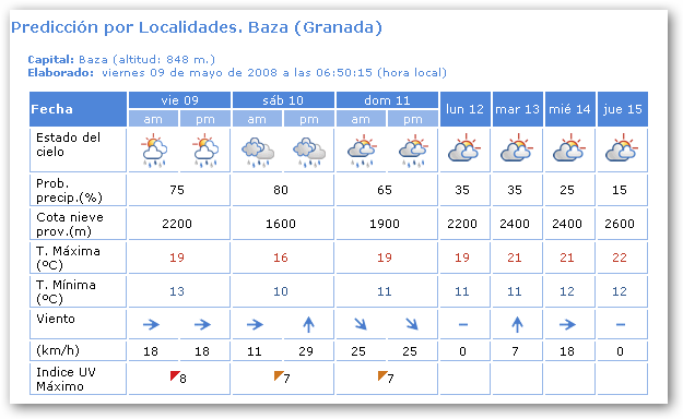 Nuboso en el interior, e intervalos nubosos en el litoral, con chubascos localmente moderados y ocasionalmente tormentosos, más probables en el interior. Temperaturas mínimas sin cambios o en ligero descenso; máximas sin cambios o en ligero ascenso. Vientos de componente Oeste, flojos aumentando a moderados en el interior; moderados aumentando a fuertes en el litoral.