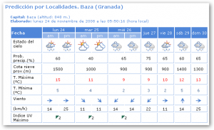 Cielos poco nubosos o despejados aumentando durante la tarde en el interior a nubosos con precipitaciones débiles a últimas horas, en forma de nieve en cotas superiores a 1300-1500 mts. Temperaturas sin cambios o en ligero descenso. Vientos de componente oeste; moderados en el interior, con intervalos fuetes en las comarcas orientales, y fuertes en el litoral con intervalos de muy fuertes.