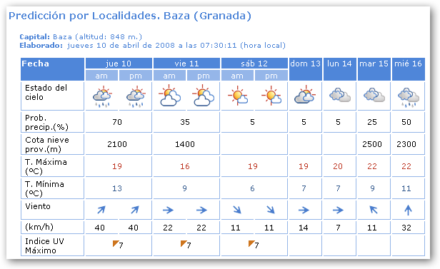 «Nuboso a muy nuboso, con precipitaciones moderadas localmente fuertes, y ocasionalmente acompañadas de tormentas. Temperaturas nocturnas en ligero a moderado descenso, y diurnas sin cambios o en ligero descenso. Vientos del suroeste en el interior, moderados a fuertes con intervalos de muy fuertes en cotas altas, y de componente oeste en el litoral, flojos a moderados aumentando a fuertes.