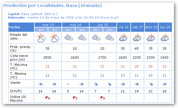 «Intervalos nubosos aumentando a nuboso en el interior, con chubascos débiles, localmente moderados, menos probables en el litoral, y que ocasionalmente podrían ir acompañados de tormentas. Brumas matinales en puntos del Interior. Temperaturas sin cambios o ligero ascenso. Vientos flojos variables en el interior, tendiendo a componente oeste y aumentando a moderados, y de componente oeste, moderados en el litoral.