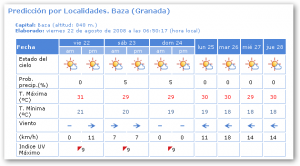 «Intervalos de cieolos nubosos disminuyendo a poco nubosos durante el día por el oeste; probabilidad de chubascos débiles durante el día. Brumas matinales costeras. Temperaturas mínimas en ligero ascenso, y máximas en ligero descenso. Vientos variables flojos, tendiendo por el día a componente Oeste flojos a moderados.