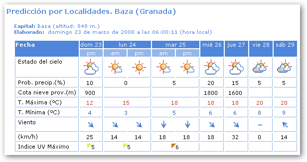 Previsión meteorológica para la provincia de Granada, ofrecida por el Instituto Nacional de Meteorología: