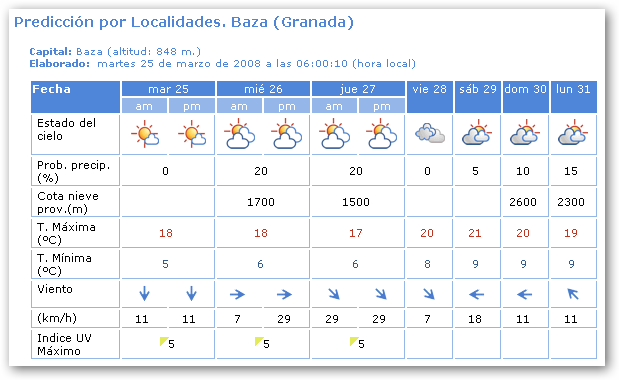 Previsión meteorológica para la provincia de Granada, ofrecida por el Instituto Nacional de Meteorología: