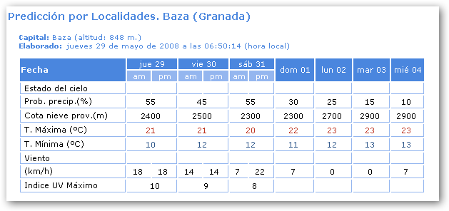 «Cielos poco nubosos en el extremo oriental y litoral; intervalos nubosos en el resto aumentando por el día a nubosos o muy nubosos en el interior con precipitaciones débiles. Temperaturas nocturnas sin cambios; diurnas en ligero ascenso. Vientos de componente Oeste; flojos en el interior, y moderados en el litoral.