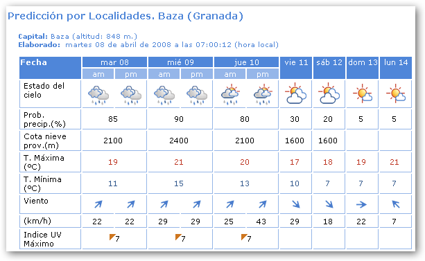 En la zona de Guadix y Baza, se mantiene la alerta por precipitaciones desde las 10’00h del 08/04/2008 a 00’00h del 10/04/2008; y por vientos con rachas máximas de 70 km/h. (Cuenca del Genil, Guadix Baza y Costa granadina) desde 10’00h del 08/04/2008 a 00’00h del 09/04/2008.