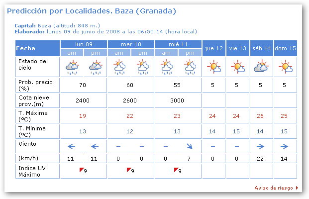 «Cielos nubosos a muy nubosos en el interior con chubascos débiles a moderados, ocasionalmente acompañados de tormentas, con posibilidad de que sean localmente fuertes en puntos del NE; intervalos nubosos en el litoral. Temperaturas nocturnas sin cambios, y diurnas en ligero descenso. Vientos variables flojos en el interior; de componente Este, flojos a moderados, en el litoral.