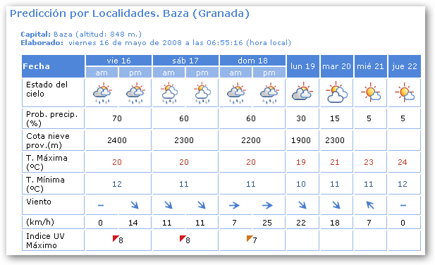 «Cielos nubosos en el interior e intervalos nubosos en el litoral; chubascos débiles dispersos más probables en el interior por la tarde donde podrán ser localmente moderados y ocasionalmente tormentosos. Temperaturas sin cambios. Vientos variables flojos en el interior tendiendo por la tarde a componente Oeste flojos; vientos de componente Oeste flojos en el litoral aumentando a moderados.