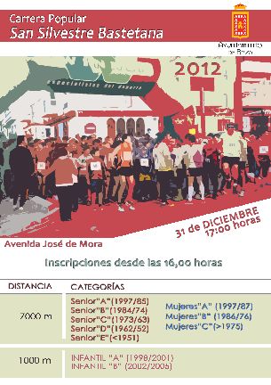 El último día del 2012, el Ayuntamiento de Baza nos brinda la oportunidad de celebrar saludablemente este fin de año acudiendo a la tradicional carrera de San Silvestre. El circuito transcurre por la Avenida José de Mora, desde el cruce con la Carretera de Ronda hasta el cruce con Virgen del Saliente hasta completar el kilometraje de cada categoría, siendo de 1 km para los infantiles y de 7 km para los adultos.