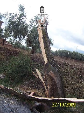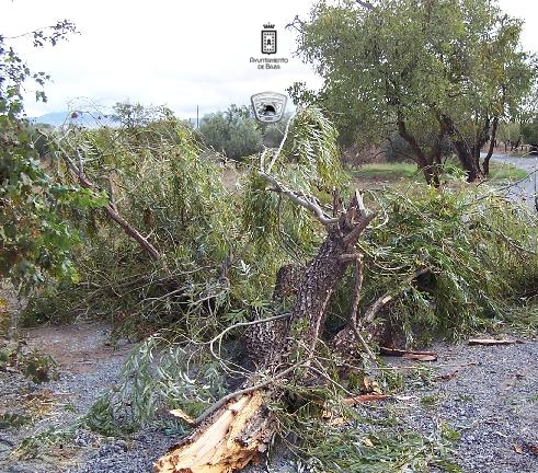 - 12’15 horas. CAÍDA DE ÁRBOL. Baza. El fuerte viento ha derribado un árbol en el Camino de las Cuatro Piedras, imposibilitando el tránsito de vehículos. Personal de este Servicio se ha desplazado al lugar donde han troceado y retirado el árbol de la vía pública.