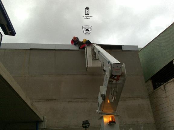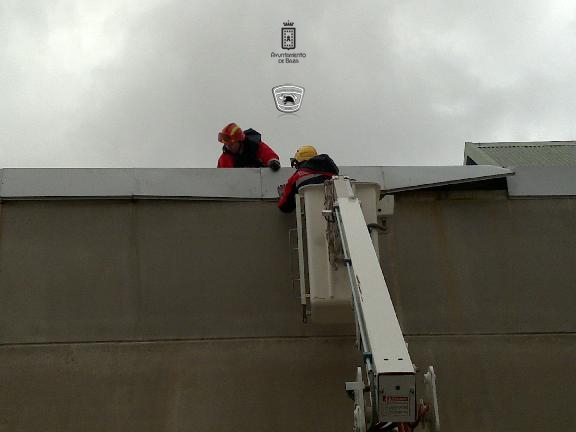 - 11’03 horas. DESPRENDIMIENTO. Baza. A causa de las inclemencias meteorológicas por el fuerte viento, ha sido necesaria la intervención de los bomberos para el aseguramiento y fijación de un tramo de cubierta de la Piscina Municipal. Han colaborado los Electricistas Municipales.