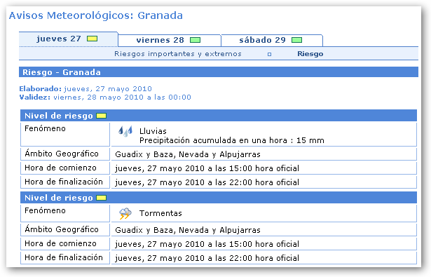 La Agencia Estatal de Meteorología informa de fenómenos con NIVEL DE ALERTA AMARILLA en Guadix, Baza, Nevada y Alpujarras.